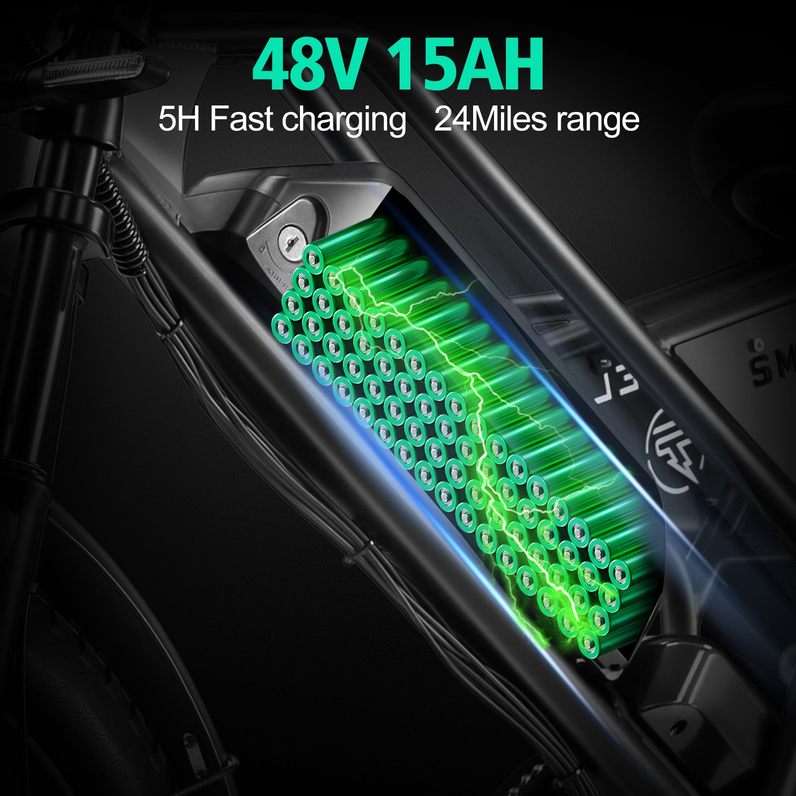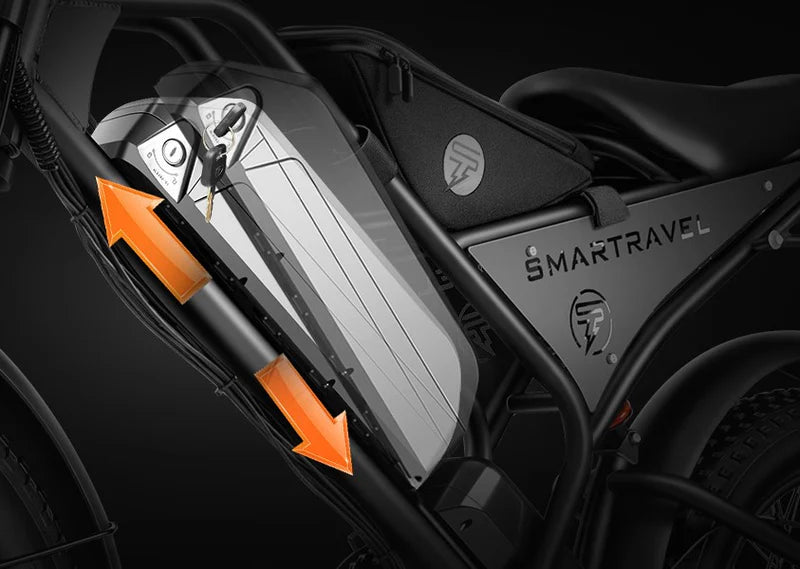 The Smartravel bike features advanced battery technology with a 48V 18.2AH battery (873.6Wh), offering enhanced range, stability, and safety. It covers up to 26+ miles in electric mode and 45+ miles in PAS mode. The BMS ensures smart protection, maintaining 80% capacity even after 800 charges, ensuring durability and efficiency.